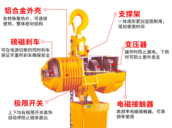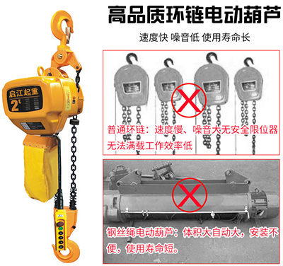 吊上吊下都有極限開關(guān)裝置,使自動停止,防止鏈 條超出,確保安全。