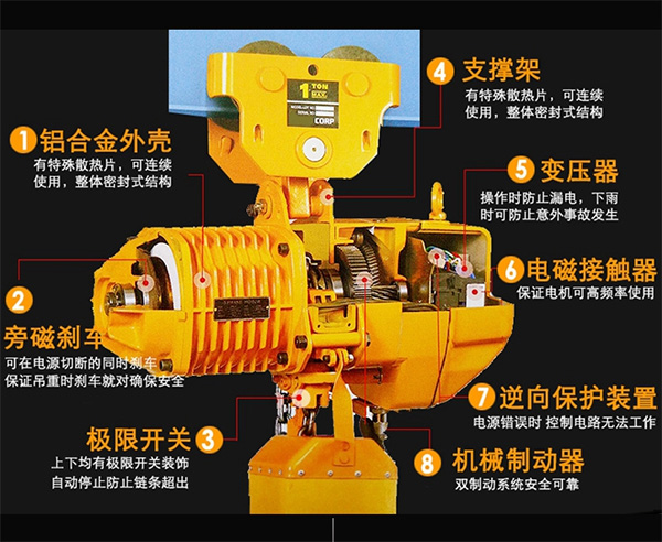 1、極限開關(guān):吊上吊下都有極限開關(guān)裝置,到達(dá)極限自動(dòng)停止,防止鏈條超出。