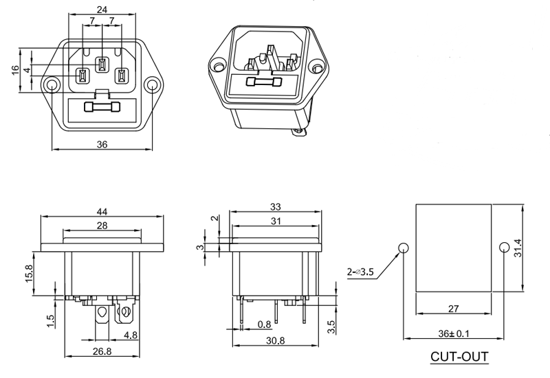 治具插座S-03系列,單插、二合一、三合一保險插座等多種規(guī)格,大電流10A ,15A,產(chǎn)品通過UL VDE CCC CB等認證,常見于家用電器,音響功放機等